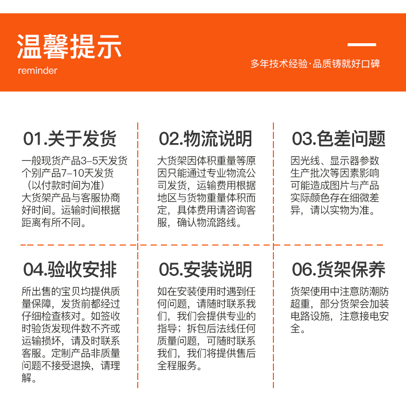 擁有CNC加工設備、噴塑流水線、無塵噴漆房,給予產品精益求精的品質保證,嚴格把控材料品質,所用材料經過6道工序嚴格檢驗,確保貨架安全穩固有保障