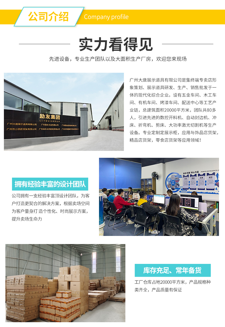 公司擁有一支經(jīng)驗(yàn)豐富的設(shè)計(jì)團(tuán)隊(duì),為客戶打造更契合的解決方案,根據(jù)賣場(chǎng)空間為客戶量身打造個(gè)性化、時(shí)尚展示方案,提升賣場(chǎng)生命力!