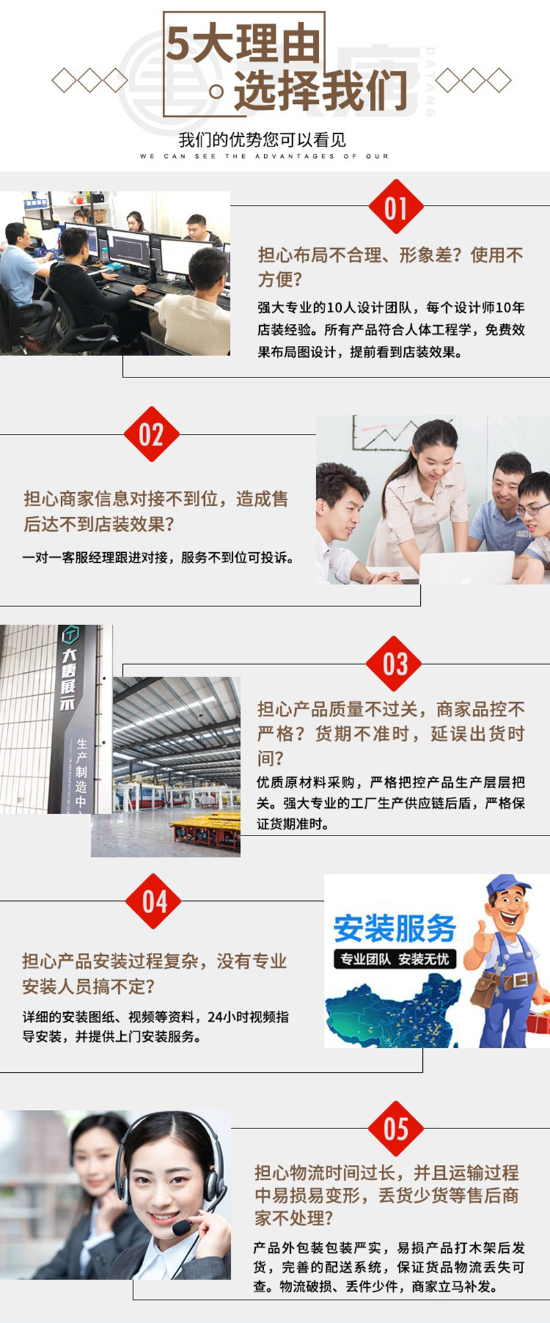 自有強(qiáng)大施工隊(duì)伍,提供現(xiàn)場(chǎng)專業(yè)安裝,有紀(jì)律、有標(biāo)準(zhǔn)的現(xiàn)場(chǎng)施工,直到客戶100%滿意,常規(guī)庫存產(chǎn)品24小時(shí)內(nèi)發(fā)貨,整店定制產(chǎn)品5-15日交貨