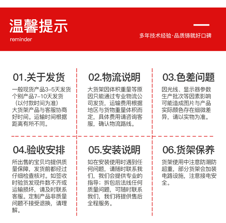 擁有CNC加工設備、噴塑流水線、無塵噴漆房,給予產(chǎn)品精益求精的品質(zhì)保證,嚴格把控材料品質(zhì),所用材料經(jīng)過6道工序嚴格檢驗,確保貨架安全穩(wěn)固有保障